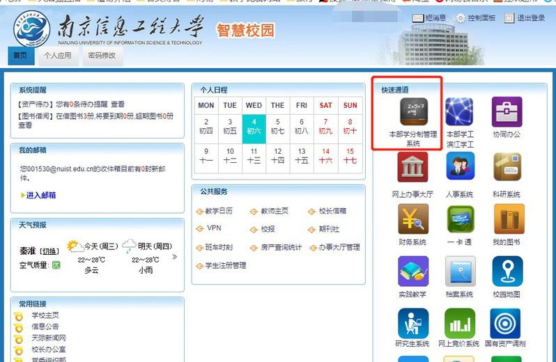 1. 使用个人账号、密码登录“校园信息门户”,点击右上角“本部学分制管理系统”。