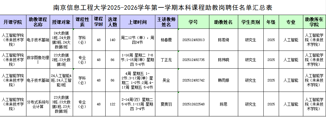 根据《南京信息工程大学本科课程助教岗位实施细则(试行)》文件要求,人工智能学院按照学校相关通知要求进行了2025-2026学年第一学期课程助教选聘工作,现将课程助教结果予以公示。