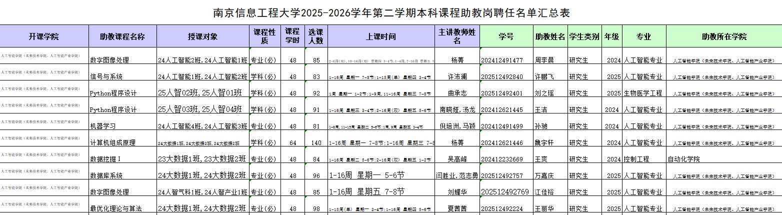 根据《南京信息工程大学本科课程助教岗位实施细则(试行)》文件要求,人工智能学院按照学校相关通知要求进行了2025-2026学年第二学期课程助教选聘工作,现将课程助教结果予以公示。
